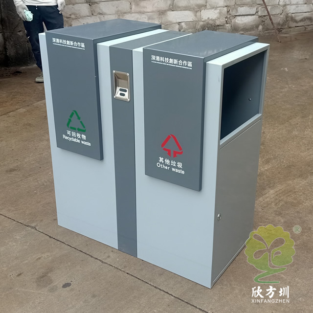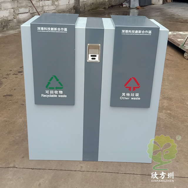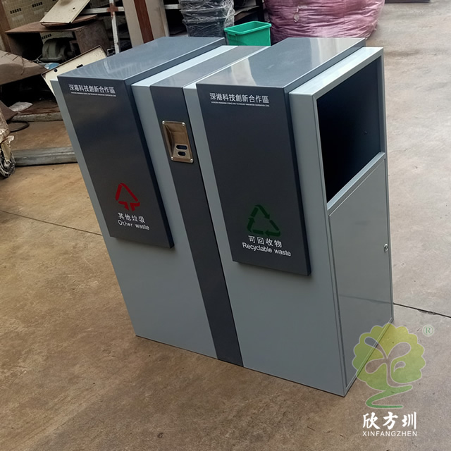 戶外方形分類鋼制垃圾桶采用了加厚的冷軋鋼板制作而成,采用了方形雙分類設(shè)計(jì),側(cè)面兩邊垃圾桶頂部方形投口,側(cè)面下邊位置是垃圾桶門可以使用三角鑰匙開門取出內(nèi)筒,表面顏色噴塑了米白和灰白,前后中上位置帶一個(gè)煙灰盅,正反面中心位置絲印了分類圖標(biāo)頂部絲印了企業(yè)名稱。