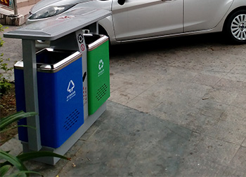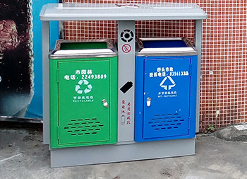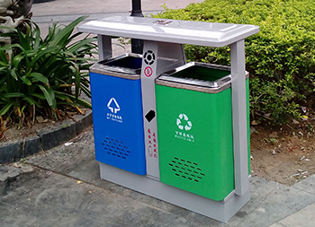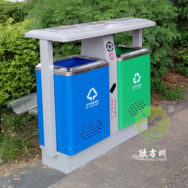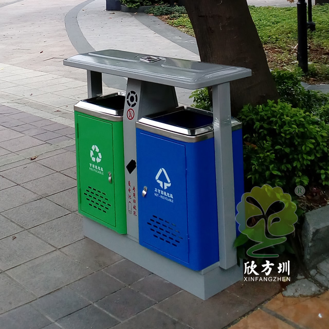 公園景區(qū)戶外鋼制分類垃圾桶采用了優(yōu)質的冷軋鋼板制作而成,兩分類高檔精品設計,框架淡灰色、不可回收垃圾桶藍色、可回收垃圾桶綠色表面上色采用了噴涂噴塑,絲網印刷采用了白色,中間中下兩邊含有一個廢電池投口,中上帶一個煙灰盅投口,支持定制可以選擇性開煙灰投口或者不開。