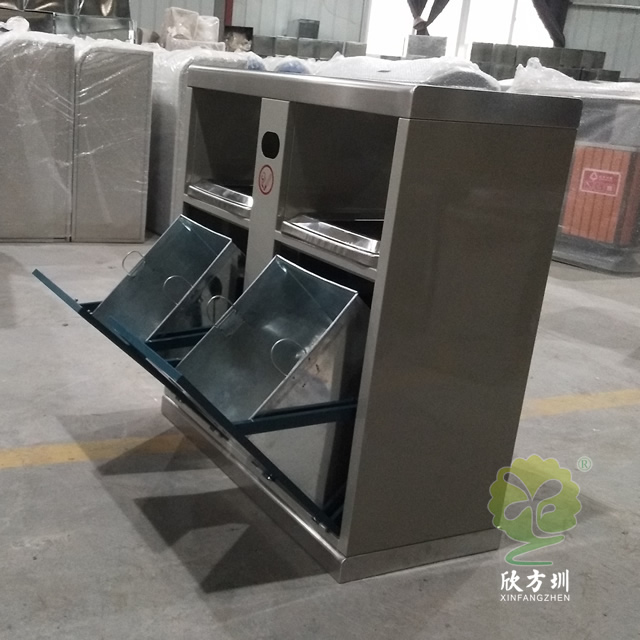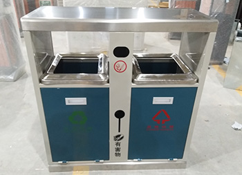戶(hù)外小區(qū)雙分類(lèi)鋼制垃圾箱采用了優(yōu)質(zhì)的冷軋鋼板制作而成,可回收物、其他垃圾兩分類(lèi)方形雙面投口設(shè)計(jì),桶身采用了米白色和深藍(lán)色噴涂噴塑上色工藝,桶身雙面中下部位帶有害物和廢電池投口,中上部位雙面帶煙灰投口,絲網(wǎng)印刷了分類(lèi)標(biāo)識(shí)和有害物,投口精耕細(xì)作,抽拉式開(kāi)門(mén)取出內(nèi)筒。