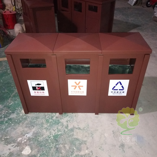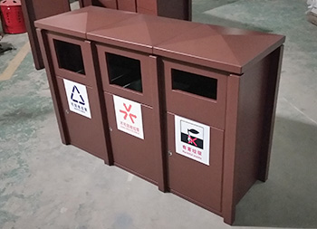 戶外大型噴塑三分類鋼板垃圾箱采用了全新冷軋鋼板料制作而成,經(jīng)過一系列的裁剪、折彎、焊接、打磨、噴塑、組裝等工序,桶身規(guī)格比較大采用了三分類可回收垃圾、不可回收垃圾、有害垃圾雙面單桶組合式無煙灰盅正面開門設(shè)計,桶身表面整體為噴塑咖啡色。