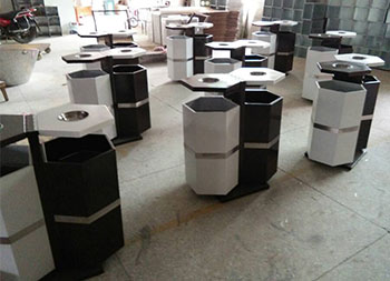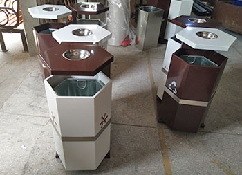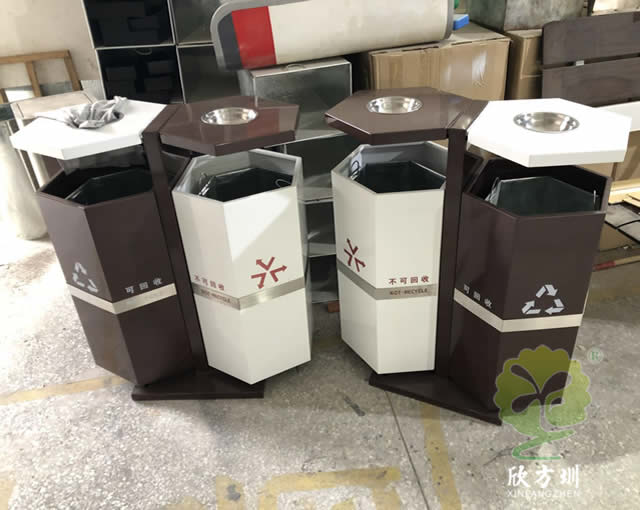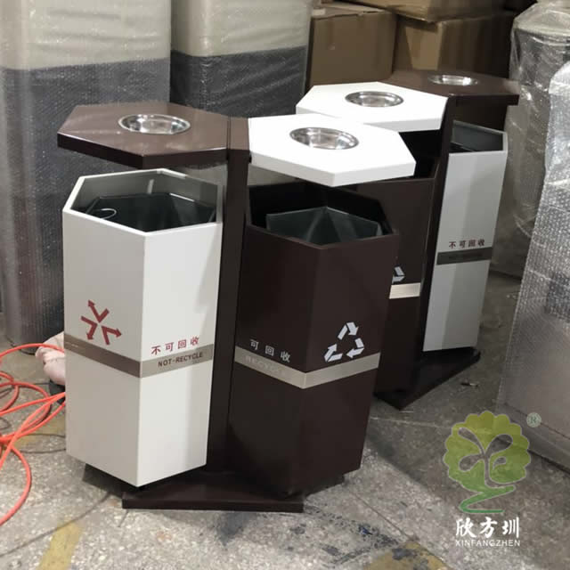 六邊形戶外鋼制分類垃圾桶采用優(yōu)質(zhì)的冷軋鋼板制造而成,這個(gè)垃圾箱六邊形不可回收、可回收兩分類設(shè)計(jì),頂部帶有兩個(gè)煙灰盅方便收集煙灰煙頭,底部帶四個(gè)膨脹螺絲孔可以固定在地面防止挪動(dòng)被盜,可以定制絲印垃圾分類圖標(biāo)以及企業(yè)logo,工藝采用了噴涂噴塑不掉色。
