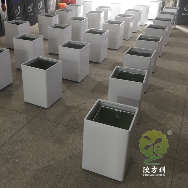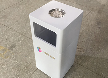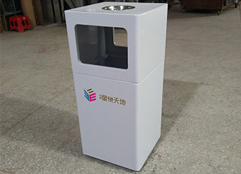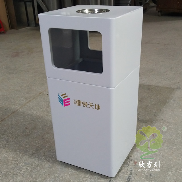 商場室內(nèi)方形金屬鋼制果皮箱采用優(yōu)質(zhì)的冷軋鋼板折彎焊接打磨而成,垃圾桶身整體采用了白色的噴涂噴塑工藝上色,這款垃圾桶是絲印東部新悅天地企業(yè)名稱和彩色的LOGO,頂部中心位置帶一個(gè)煙灰盅方便收集煙灰煙頭,整體設(shè)計(jì)簡潔美觀,支持定制絲印或者使用其他工藝。