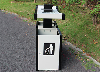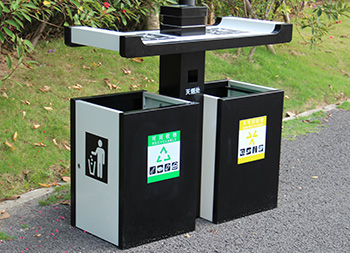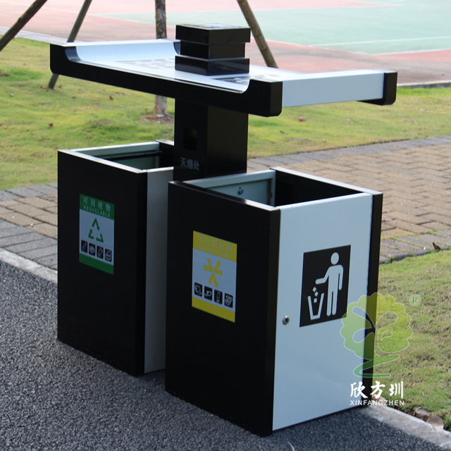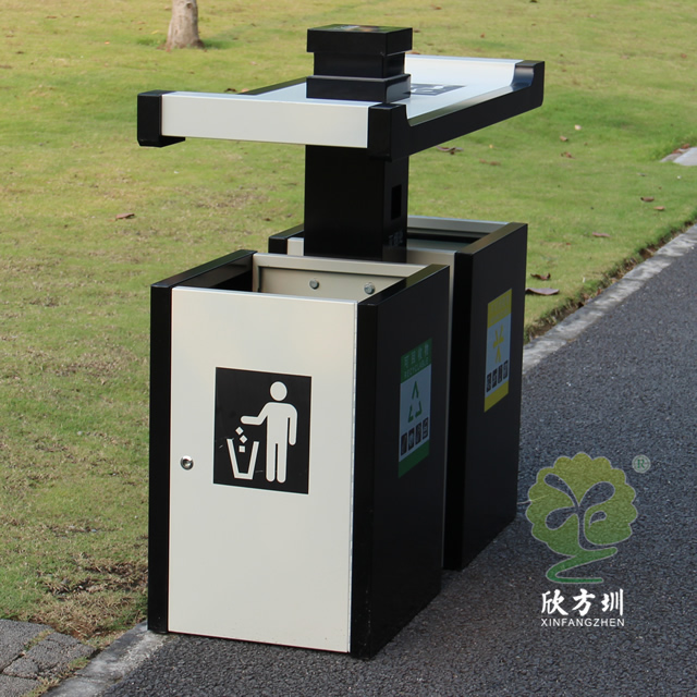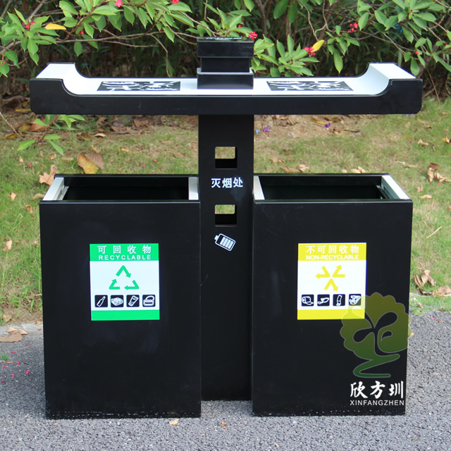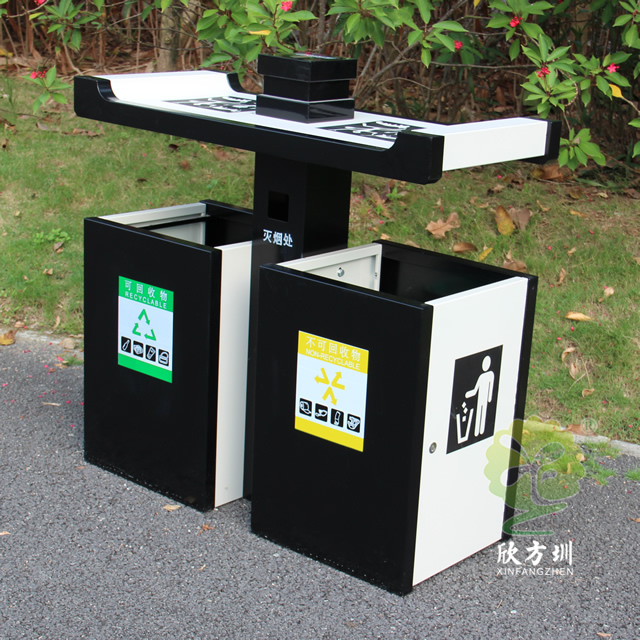 室外噴塑冷軋鋼板分類垃圾箱采用優(yōu)質(zhì)的冷軋鋼板制作而成,復(fù)古方形雙桶可回收物、不可回收物兩分類大投口設(shè)計(jì),黑色、白色組合噴塑工藝,中間帶一根柱子中上部分帶一個(gè)滅煙處投口底部帶一個(gè)廢電池投口,底部有一個(gè)三角鑰匙鎖打開可以取出廢電池和煙頭,桶身左右?guī)氰€匙鎖頭開門可以取出內(nèi)筒。