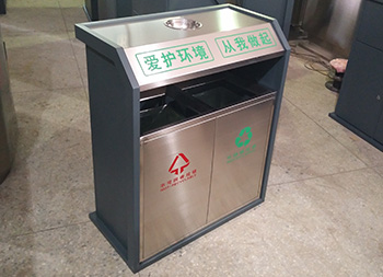 戶外市政道路兩分類鋼板垃圾箱這款垃圾桶采用了優(yōu)質(zhì)的冷軋鋼板裁剪焊接而成,可回收垃圾、不可回收垃圾屋形雙分類設(shè)計,頂部帶煙灰盅方便滅煙收集煙頭,坡面絲印了“愛護環(huán)境、從我做起”,桶身框架灰色噴塑工藝,這款產(chǎn)品我們廠家支持定制三、四、五分類,可以不選擇煙灰盅。
