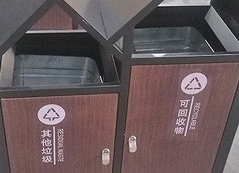 園林景觀屋形冷軋鋼板分類垃圾箱采用了全新優(yōu)質(zhì)1.0mm厚冷軋鋼板制造而成,兩分類連體尖頂屋形設(shè)計(jì),整體垃圾桶框架黑色噴涂噴塑,正面推拉門板仿轉(zhuǎn)木紋效果,門板油墨絲印了新國(guó)標(biāo)其他垃圾、可回收物分類標(biāo)識(shí),三角鑰匙開門方便取出內(nèi)置的內(nèi)筒,可回收箱側(cè)面上方帶一個(gè)滅煙盒。