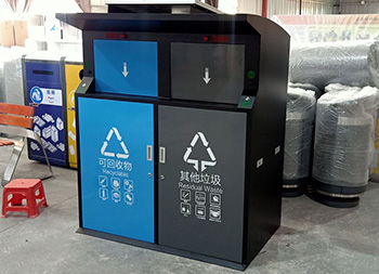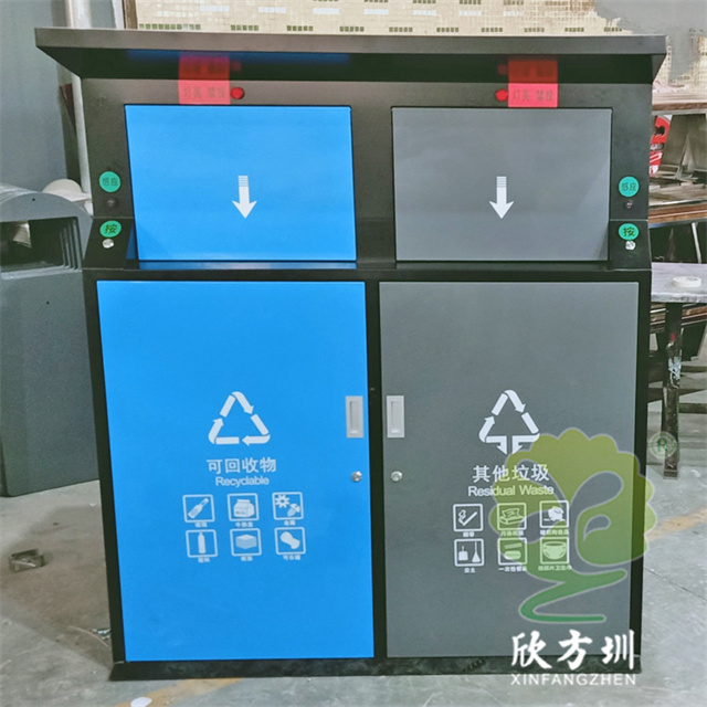 戶外智能感應(yīng)鍍鋅板分類(lèi)垃圾桶采用了優(yōu)質(zhì)的鍍鋅板制造而成,框架?chē)娡繃姺酆谏苫厥瘴镩T(mén)板和投口噴塑了藍(lán)色,其他垃圾門(mén)板和投口噴塑了灰色,左右兩邊帶觸摸感應(yīng)開(kāi)蓋和按鍵開(kāi)蓋,投口上方帶指示燈,可以定制不銹鋼材質(zhì)的,或者三分類(lèi)及四分類(lèi)垃圾箱。