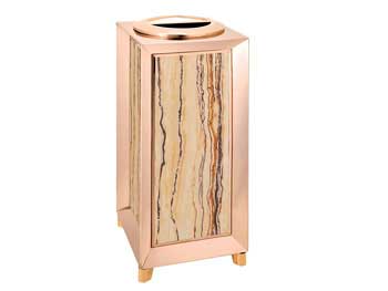 欣方圳鈦金垃圾桶由鍍金鋼板或不銹鋼和大理石制作而成,表面經(jīng)除油、清洗、酸洗、清洗、表調(diào)、磷化、清洗、烘干、靜電粉末噴涂、高溫塑化、冷卻等工藝處理。極耐磨損、耐酸、耐堿,耐腐蝕性,永遠(yuǎn)不會生銹。產(chǎn)品表面呈金黃色,光滑亮麗,彰顯高貴本色,適用于各種高檔室內(nèi)場合。