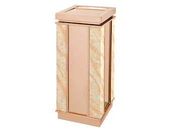 欣方圳鈦金垃圾桶由鍍金鋼板或不銹鋼和大理石制作而成,表面經(jīng)除油、清洗、酸洗、清洗、表調(diào)、磷化、清洗、烘干、靜電粉末噴涂、高溫塑化、冷卻等工藝處理。極耐磨損、耐酸、耐堿,耐腐蝕性,永遠(yuǎn)不會生銹。產(chǎn)品表面呈金黃色,光滑亮麗,彰顯高貴本色,適用于各種高檔室內(nèi)場合。