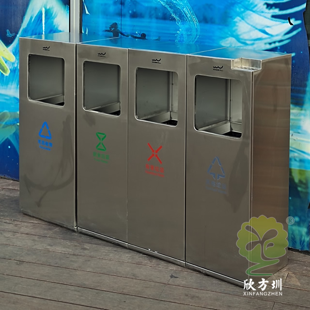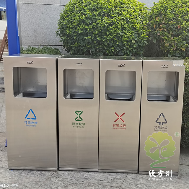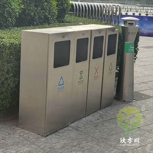 廣場(chǎng)組合式不銹鋼分類垃圾桶可以采用201或者304不銹鋼板制作,產(chǎn)品型號(hào):C819,尺寸規(guī)格:小桶尺寸340*340*985mm、大桶尺寸428*340*985mm,戶外方形本色單面投口抽拉式開門設(shè)計(jì),組合式3個(gè)小桶1個(gè)大桶直接擺放,正面中心位置絲網(wǎng)印刷了四色的最新分類標(biāo)識(shí),分別可回收物為藍(lán)色、廚余垃圾為綠色、有害垃圾為紅色、其他垃圾為黑色,正面頂部絲印黑色的企業(yè)logo,其他垃圾桶用手機(jī)帶一個(gè)滅煙盒,內(nèi)筒采用常規(guī)的鍍鋅板內(nèi)桶,這款垃圾桶時(shí)候擺放在廣場(chǎng)、公園、小區(qū)、工業(yè)區(qū)、地鐵口等場(chǎng)景,可以根據(jù)場(chǎng)景的大小定制組合式分類垃圾桶。