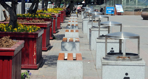 去年深圳一家工廠門前200米道路旁安放150個垃圾桶,被市民吐槽浪費(fèi),今年在西安鐘樓開元商城門口再現(xiàn)垃圾桶陣,不足50米距離安放10個垃圾桶,每個垃圾桶旁配備一條休閑長凳,有錢就是任性,但有點(diǎn)資源浪費(fèi)。