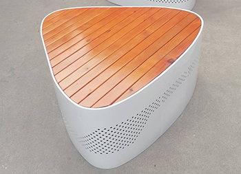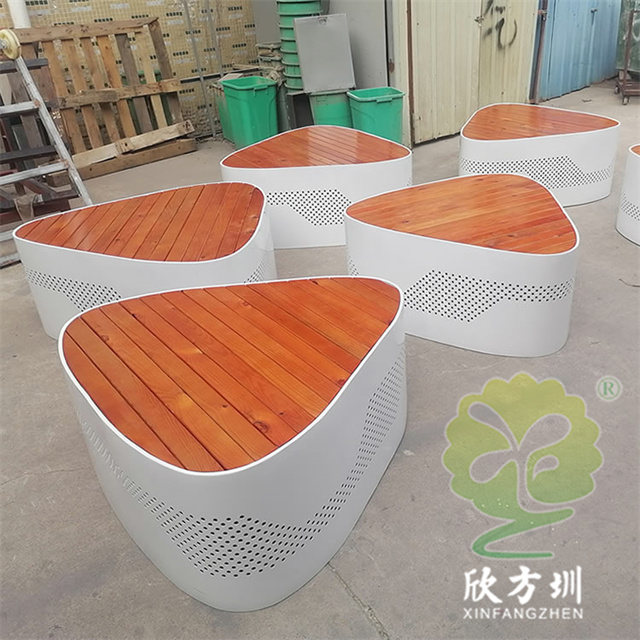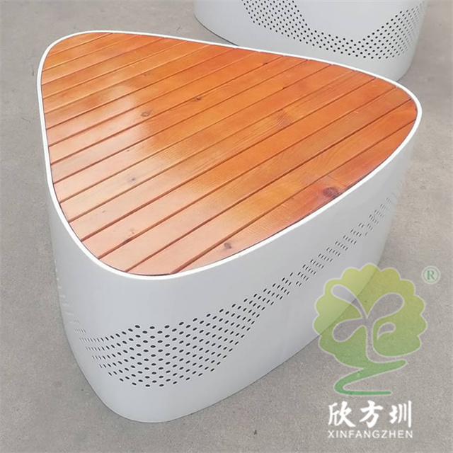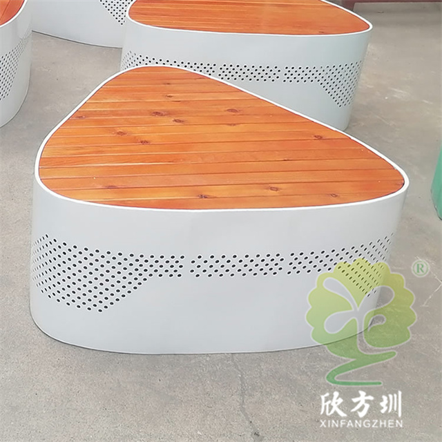 戶外三角形不銹鋼防腐木園林椅可以采用201或者304不銹鋼板制造,木條可以采用防腐松木或者竹木制作,不銹鋼板支撐架采用了2.0毫米的厚的板材,金屬做了創(chuàng)意的鏤空表面做噴塑烤漆處理工藝,支持定制各種形狀金屬加木條或者玻璃鋼加木條的戶外座椅,提成城市公共區(qū)域美觀度。